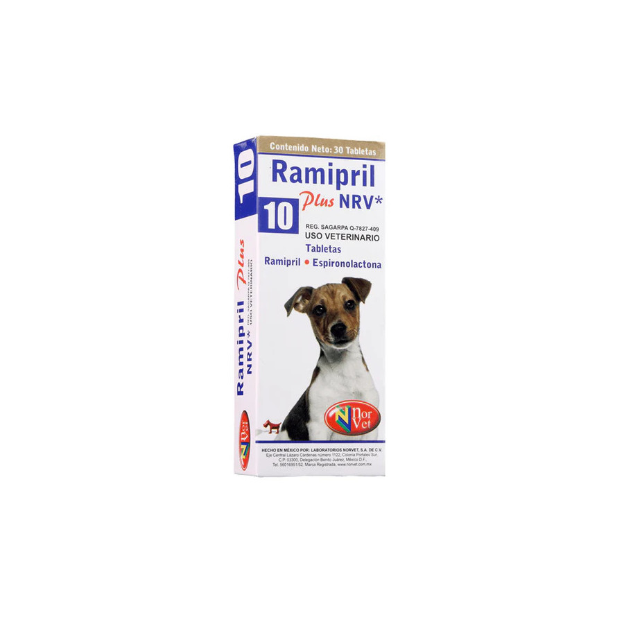 RAMIPRIL PLUS 10 NRV* es un Inhibidor de la Enzima Convertidora de la Angiotensina (IECA) que actúa como vasodilatador mixto el cual está indicado para el tratamiento de la la Insuficiencia Cardiaca Congestiva causada por Insuficiencia Valvular (Endocarditis) o Cardiomiopatía en Perros.