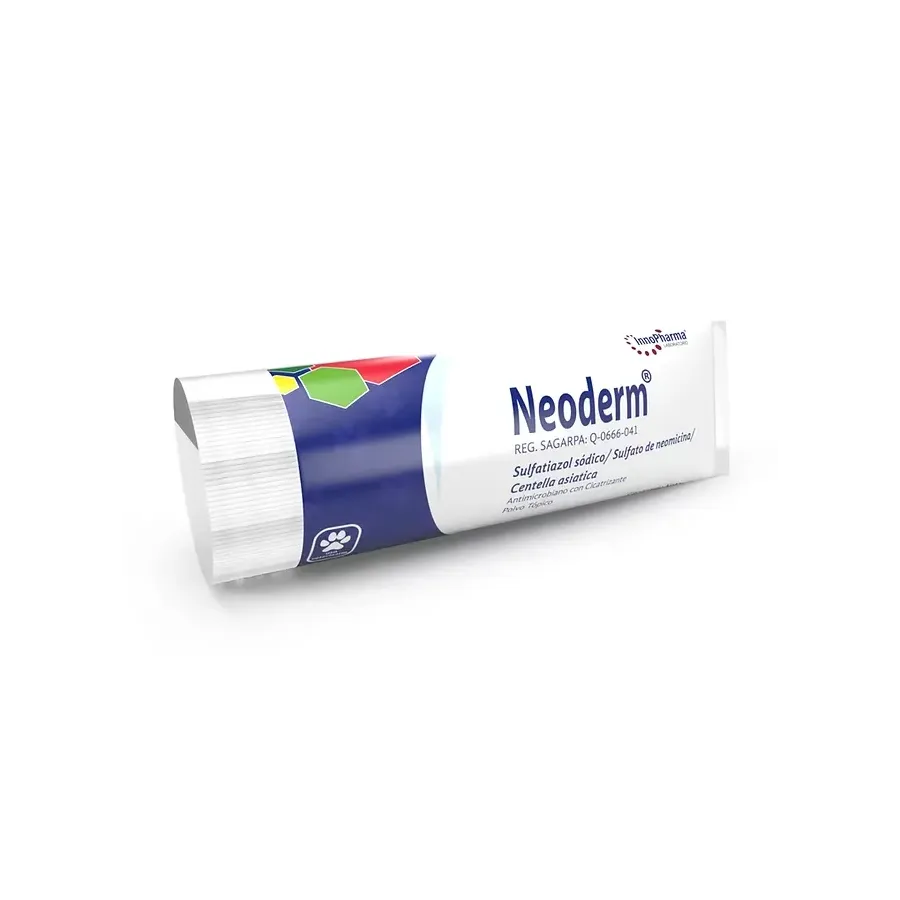 Neoderm® es un polvo tópico con propiedades antimicrobianas y cicatrizantes indicado para el tratamiento de heridas superficiales en la piel, para el tratamiento de infecciones causadas por bacterias Gram (+) y Gram (-) (Staphylococcus spp., Streptococcus spp. Y Proteus spp.).
