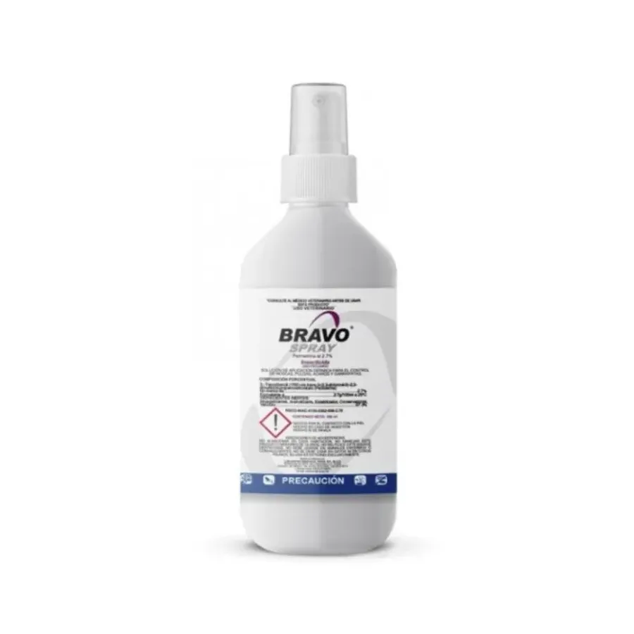 BRAVO-SPRAY es un ectoparasiticida a base de permetrina y sustancias sinergizantes que actúa contra moscas,mosquitos,tábanos,pulgas, piojos, garrapatas y ácaros de la sarna. La permetrina es un insecticida que actúa por contacto directo con el parásito provocándole la muerte.