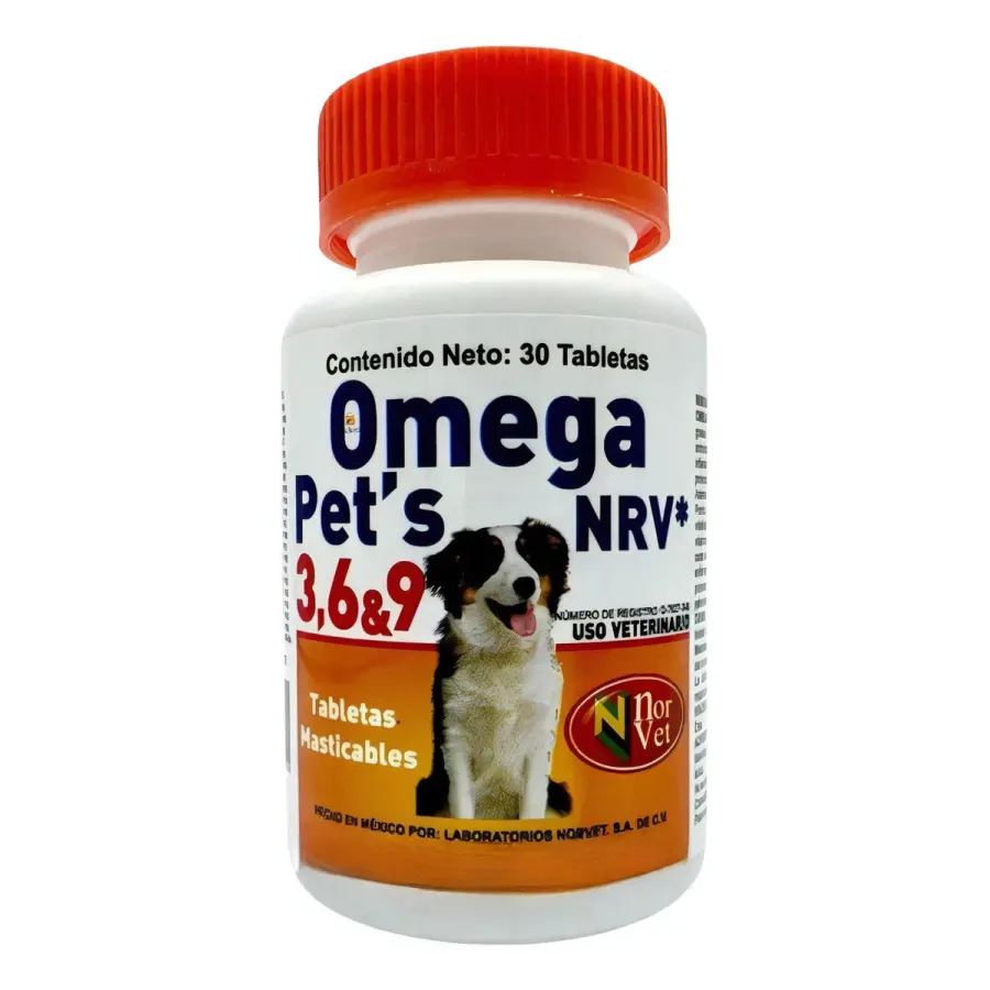 OMEGA PET´S NRV* 3,6 & 9 Contiene los principales ácidos grasos esenciales asociados con vitaminas, minerales y aminoácidos que ayudan en problemas de reacciones inflamatorias como alergias, eccemas y prurito, que pueden ser provocadas por desbalances en la cadena de ácidos grasos. Además, para mejorar y mantener sana la piel y el pelo de los perros, complementar la dieta de animales y aumentar la vitalidad de los perros, como preventivo en la deficiencias de vitaminas y minerales, preparación de perros para exposición, como auxiliar en el tratamiento de artritis, seborrea idiopática, enfermedades inflamatorias de la piel, coadyuvante en procesos inflamatorios crónicos. Contiene vitaminas y minerales necesarios para un adecuado metabolismo de la piel.